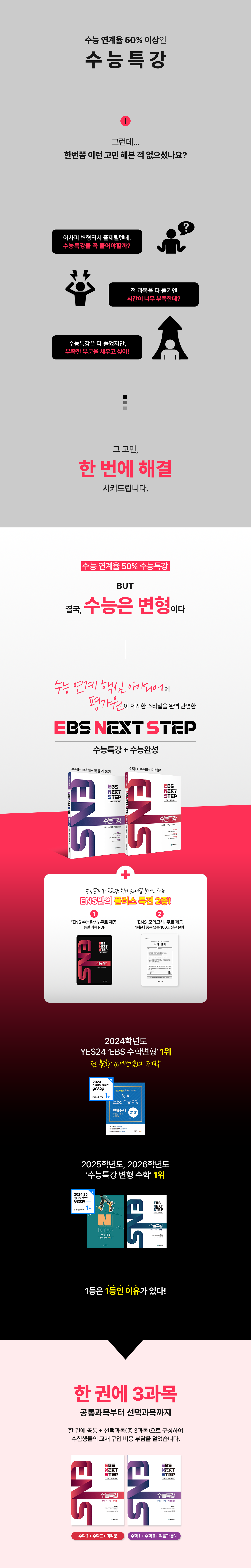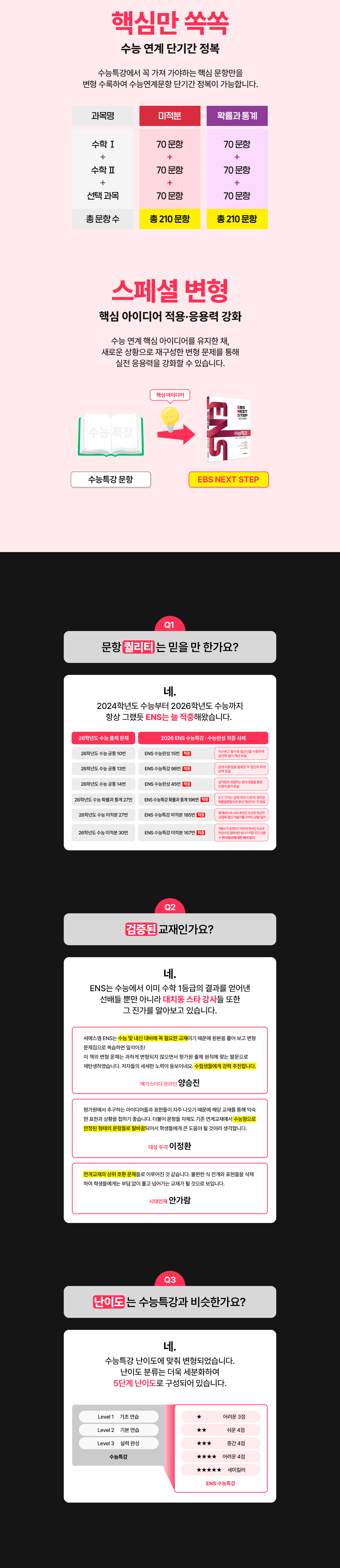 ENS 수능특강은 실제 수능 문제와 가장 유사한 「수능 적중 예상 핵심 문제」 훈련서로, 고3 모의고사 및 수능을 한 권으로 완벽하게 대비할 수 있는 교재이다. 수능 연계 교재를 완벽 분석 후, 출제 가능성이 가장 높은 문제들을 엄선하고 출제 의도를 살려 평가원이 제시한 스타일을 완벽 반영하여 제작된 문제들로만 구성하였기 때문에 지난 수능에서도 압도적인 수능 적중률을 보였다.